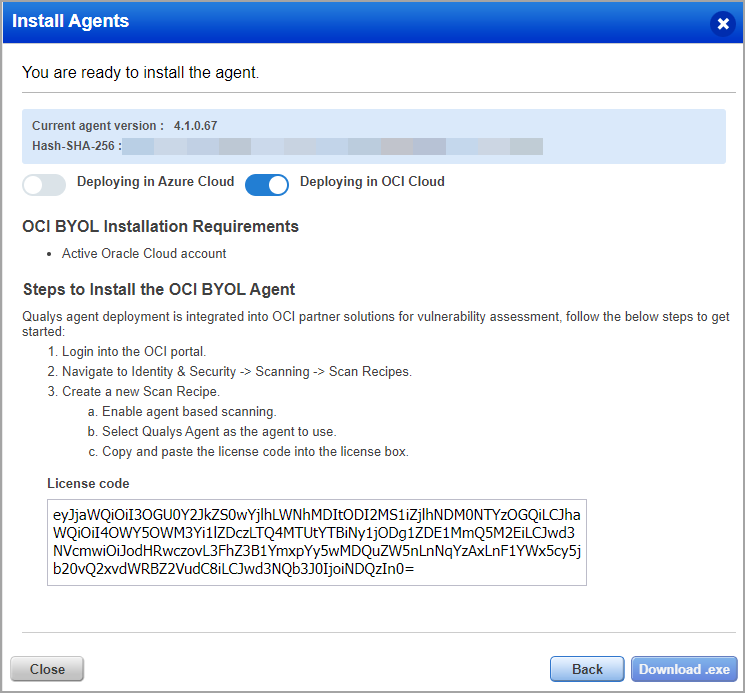 5) Follow the instructions and use the license code to install the agent in your OCI.