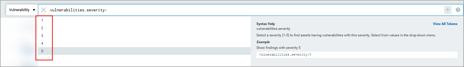 For the database query to return results, you must specify some value of the search token. You enter the token value after an operator. For some tokens, for example vulnerabilities.severity, which accept values from a fixed and finite set, you can select values from the available options.